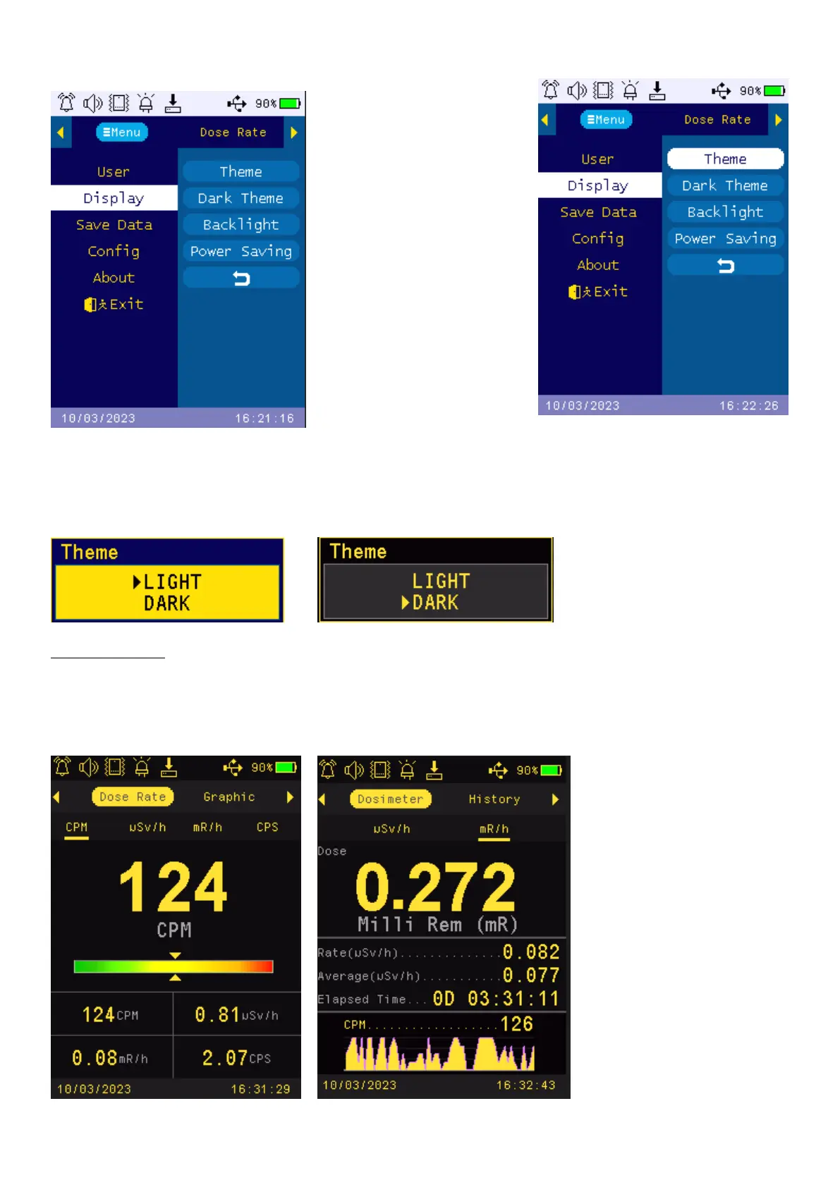 The system default them is in LIGHT mode. Once user select the DARK mode, all displays will switch to