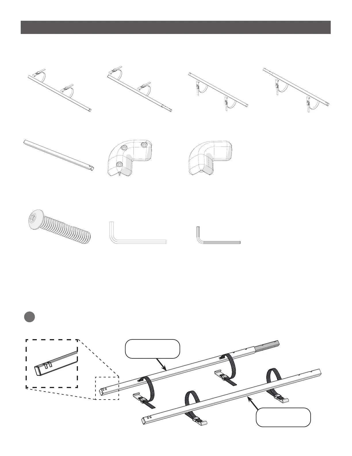 Locate the long and short take-up rails. The take-up rail pieces have two rectangular cut-