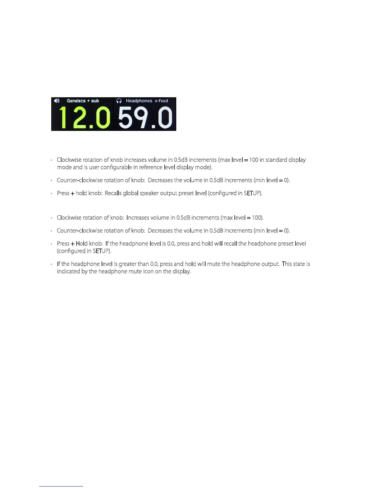 • Press + Hold knob: If the headphone level is 0.0, press and hold will recall the headphone preset level