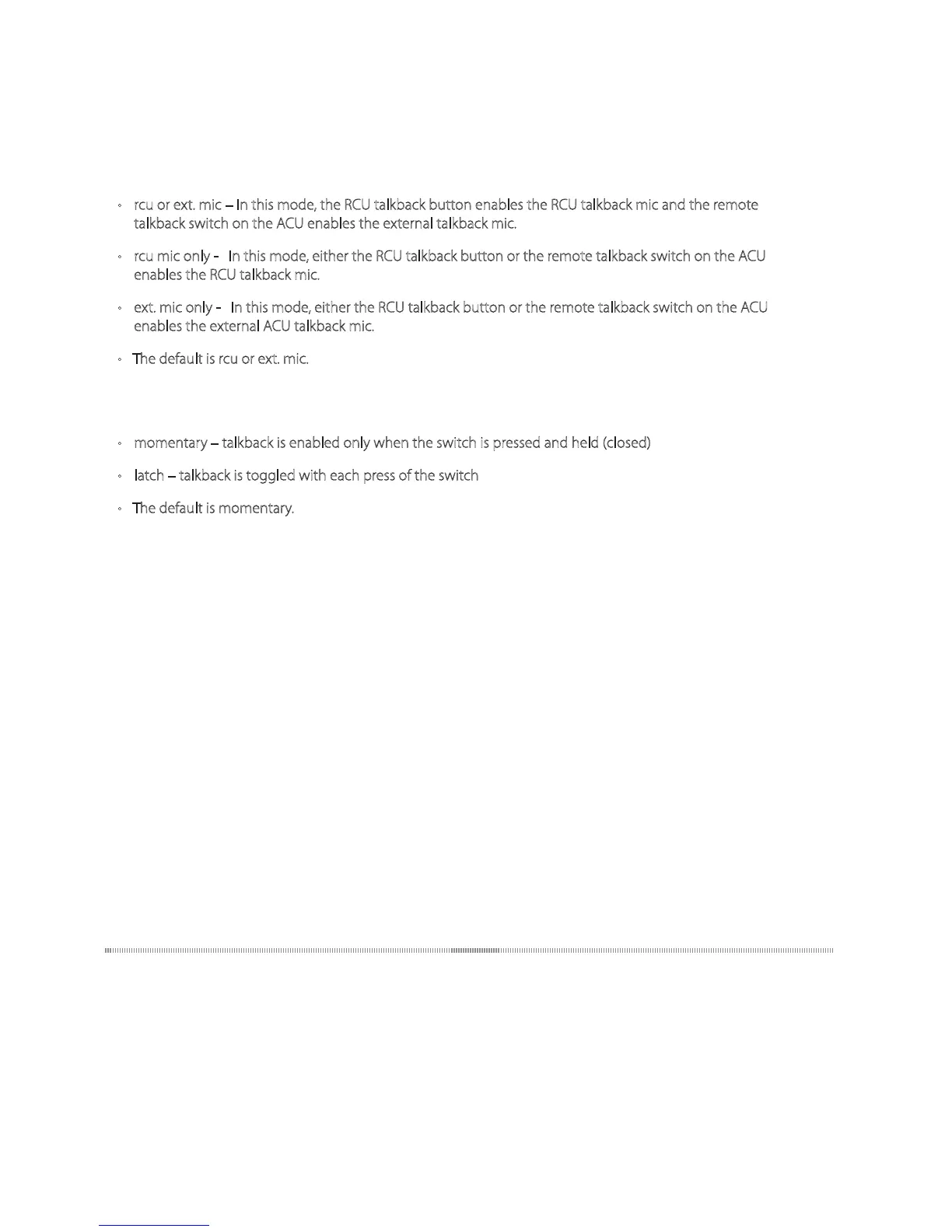 • rcu or ext. mic – In this mode, the RCU talkback button enables the RCU talkback mic and the remote