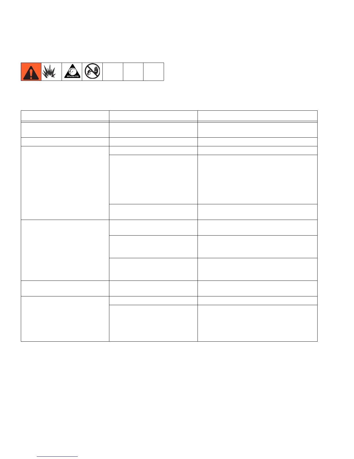 No fluid output when triggered. Spray tip plugged. Clean spray tip. See page 14.