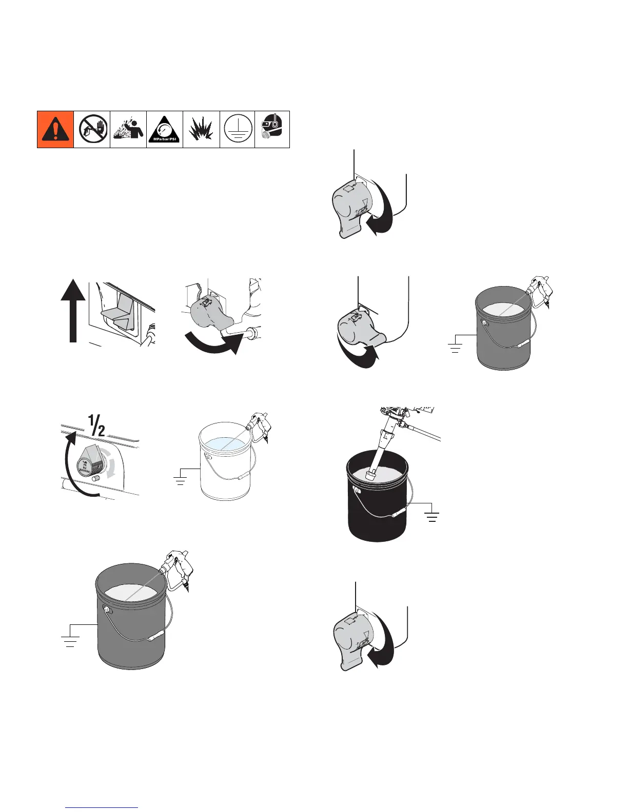 3. Increase pressure to 1/2. Hold gun against pail. Dis-