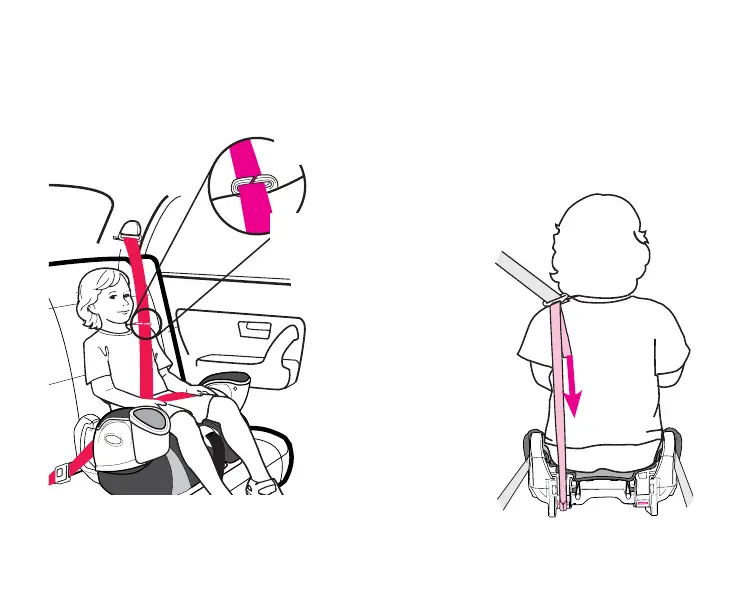 4. Slide the vehicle shoulder belt onto the clip as shown and pull free end of strap down to