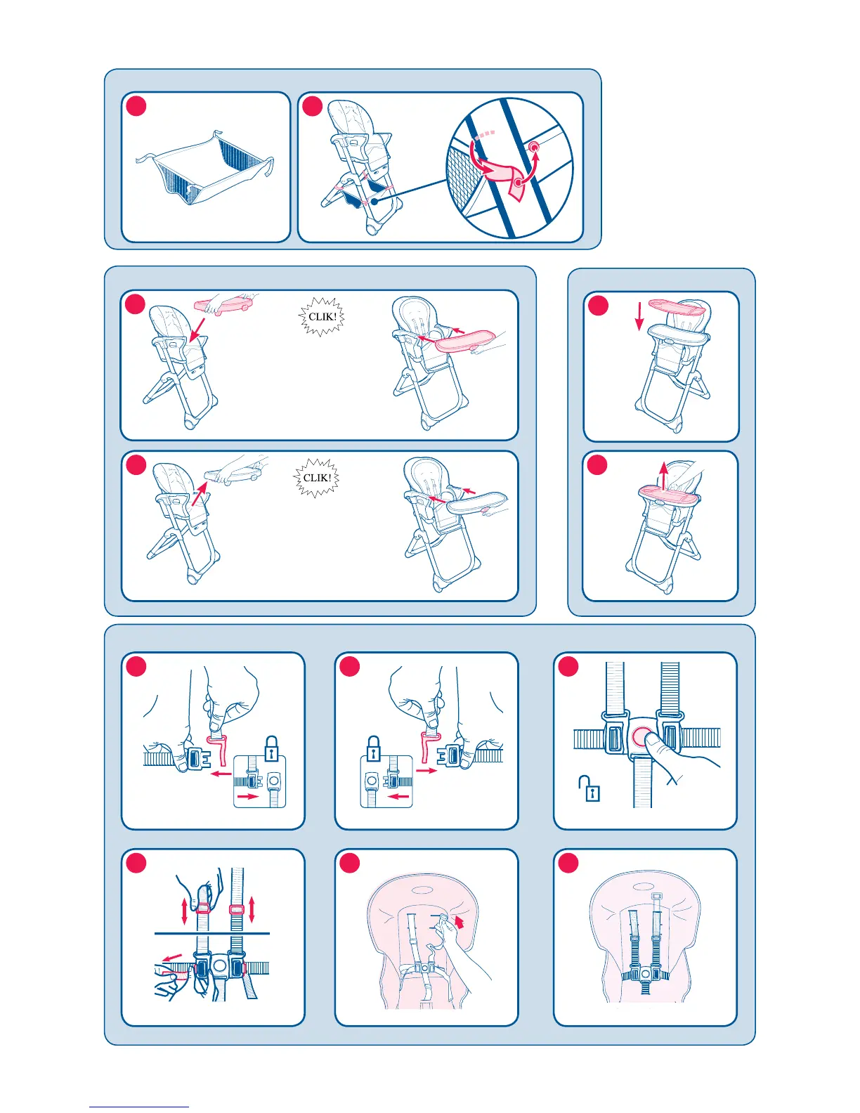 Graco DuoDiner - Basket and Tray Installation; Tray Cover Installation; Child Securing Procedure