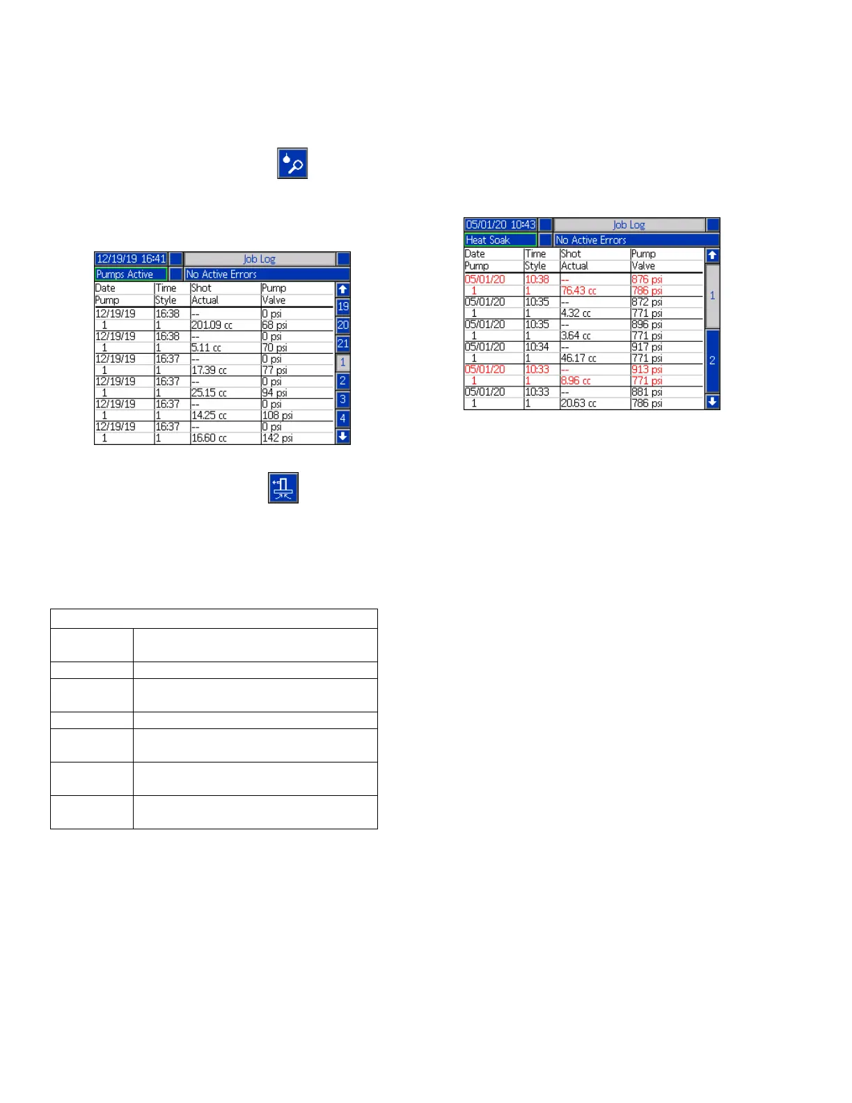Red text on the Job Log screen indicates that a job/style