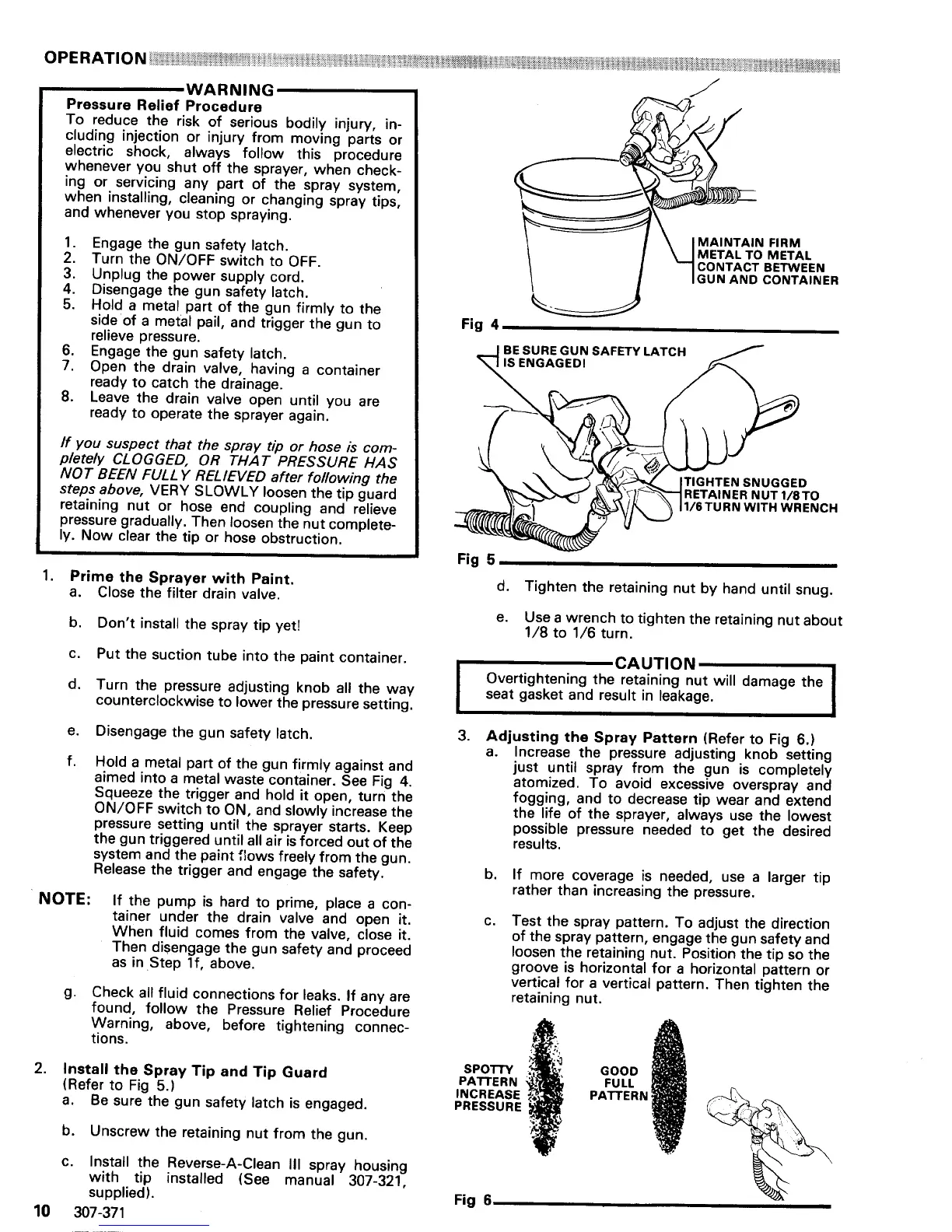 Graco EM 380 - OPERATION; Prime Sprayer with Paint; Install Spray Tip and Guard; Adjusting Spray Pattern