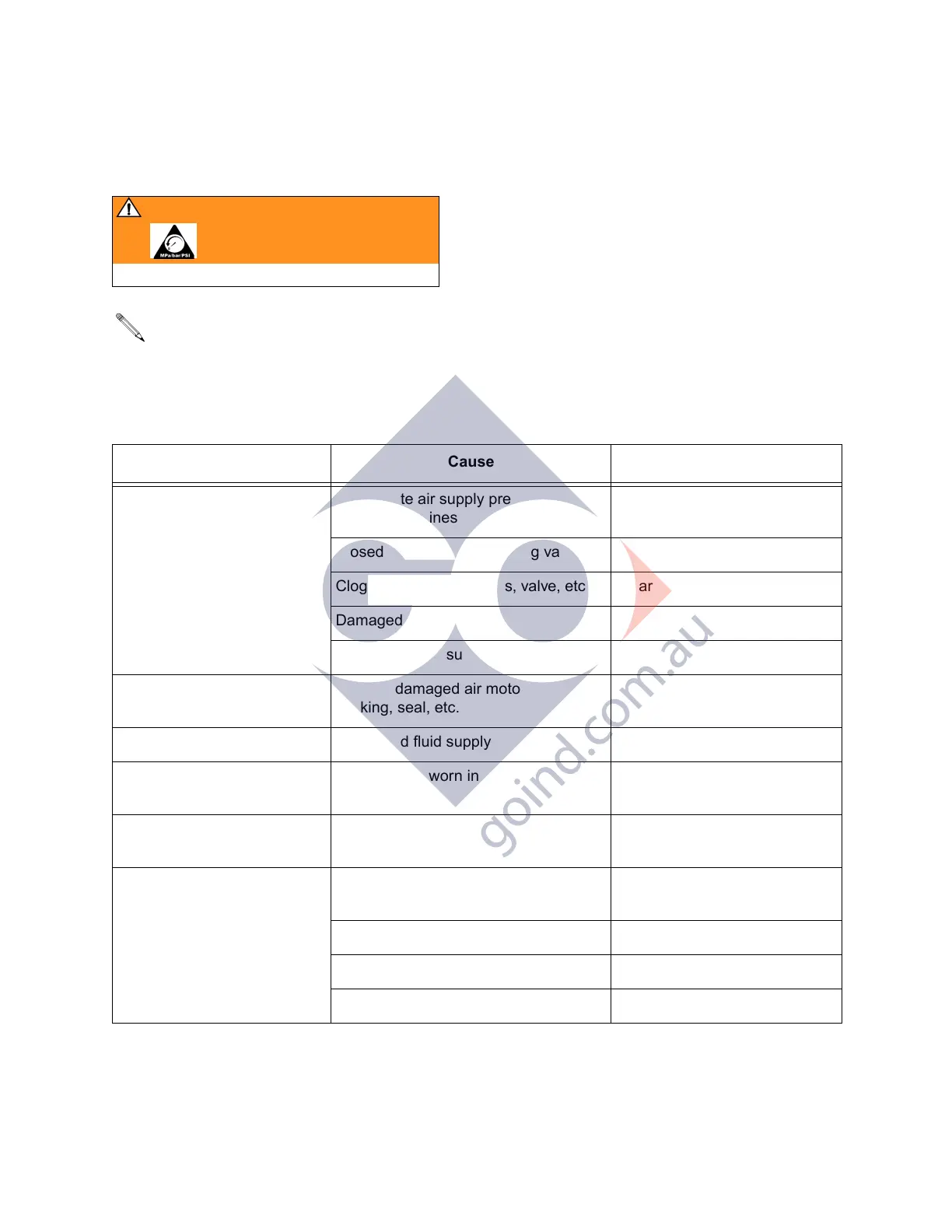 Pump fails to operate Inadequate air supply pressure or