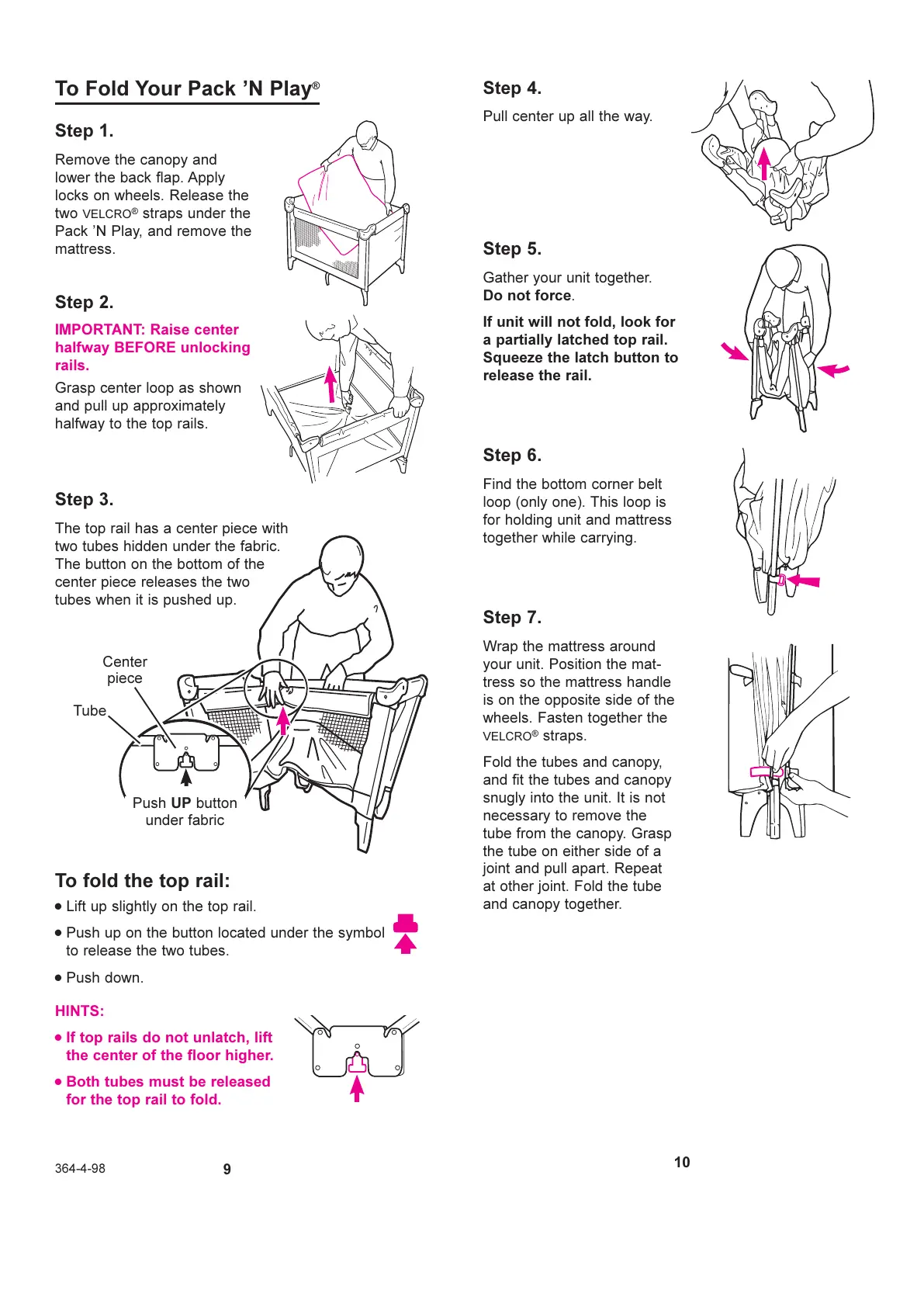 Graco Pack 'N Play 9047 - Folding and Transporting the Pack N Play; Folding Instructions; Carrying the Folded Unit