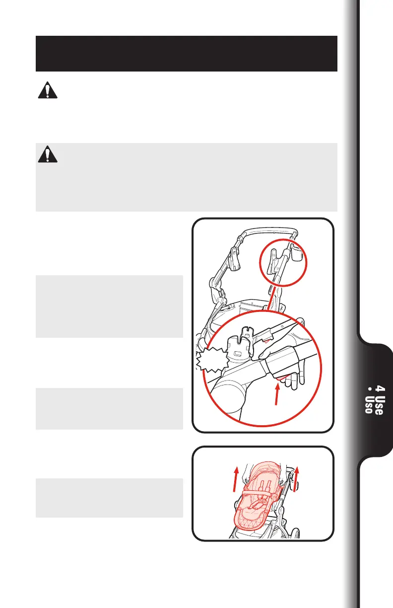 lados. Cuando realiza ajustes al asiento del cochecito, asegúrese de que la cabeza,