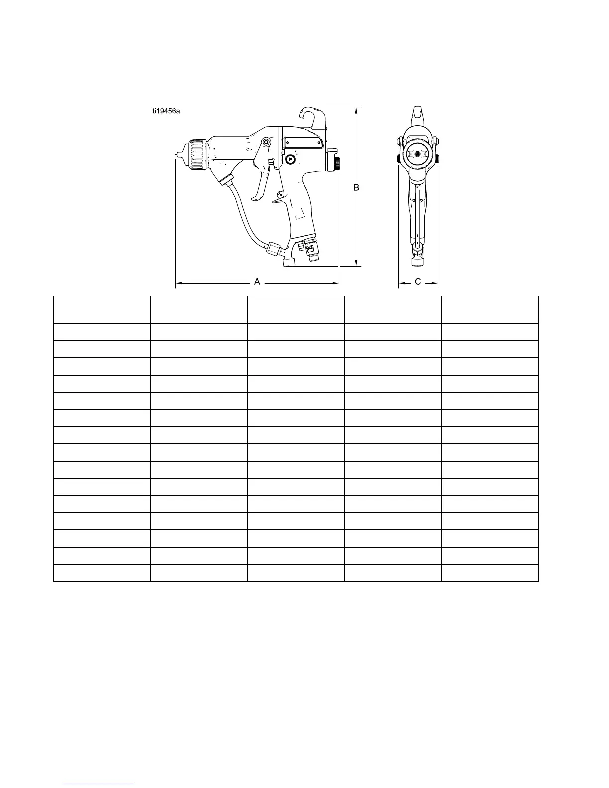 Gun Model A, in. (mm) B, in. (mm) C, in. (mm) Weight, oz (g)