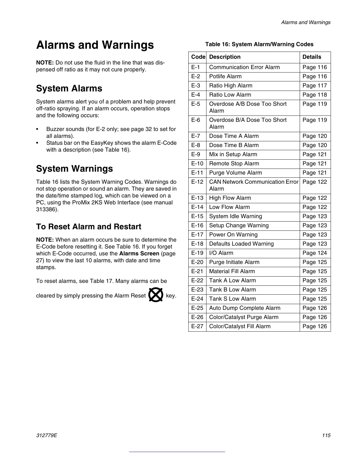 which E-Code occurred, use the Alarms Screen (page