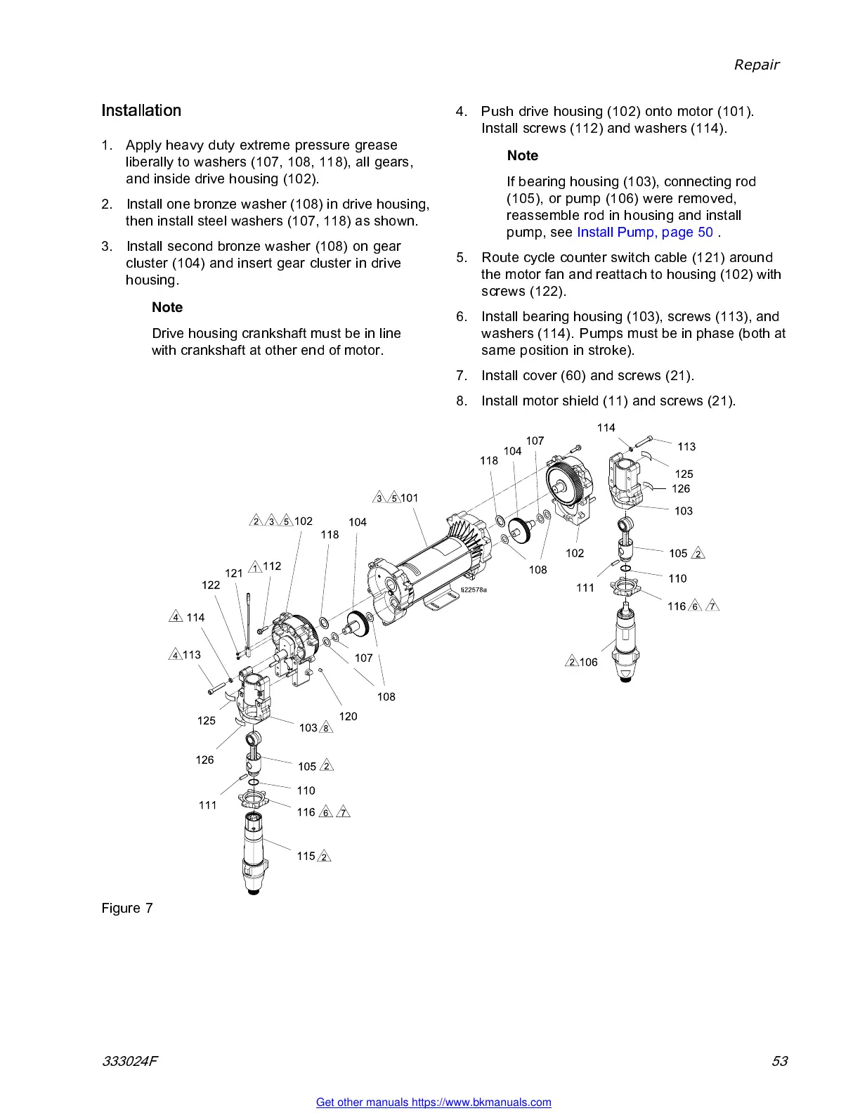 6. Install bearing housing (103), screws (113), and
