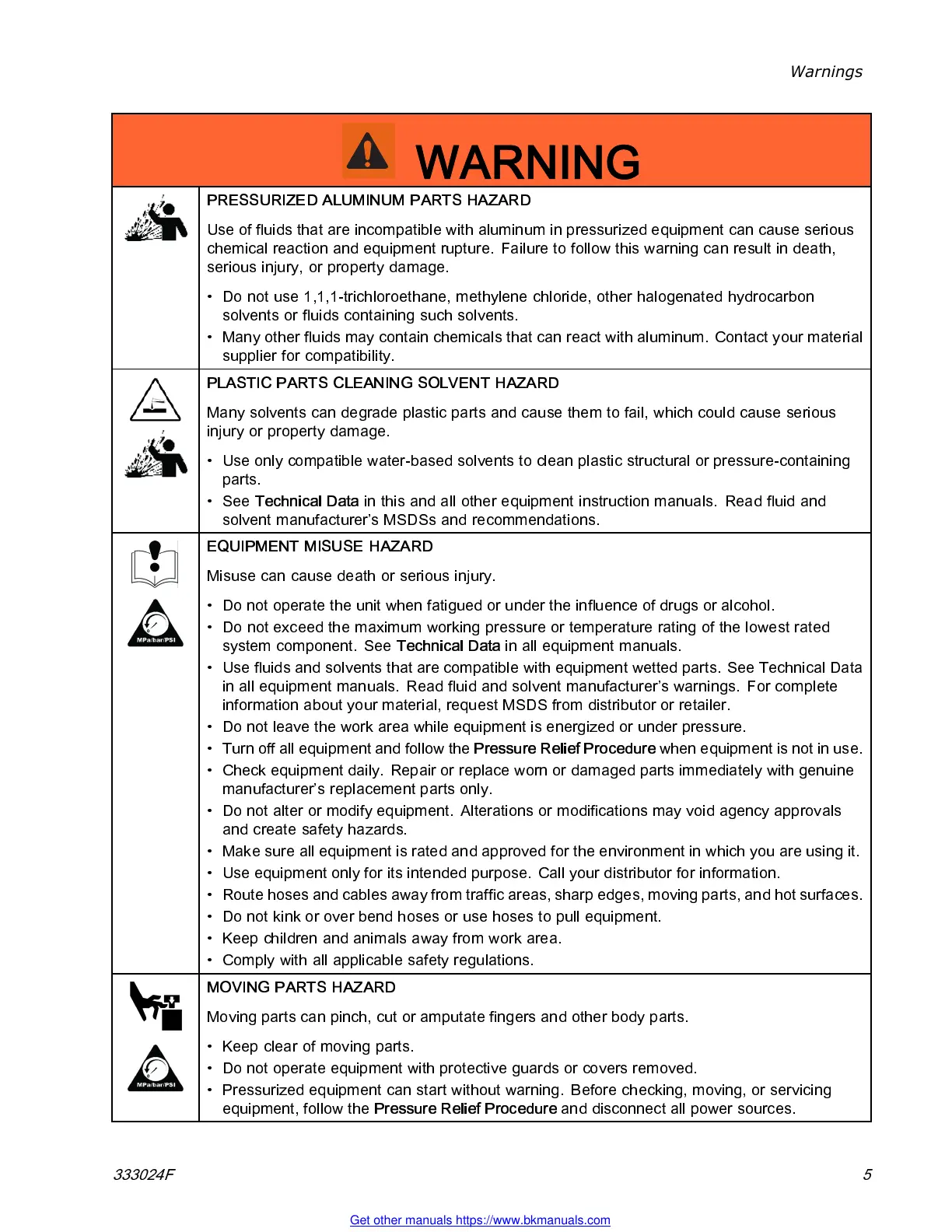 in all equipment manual s. Read fluid and solvent manufacturer’s warnings. For complete