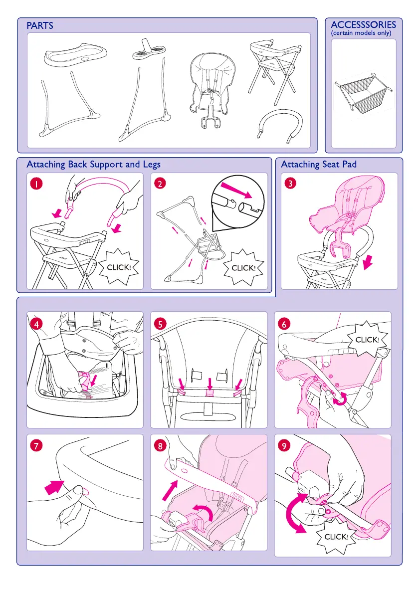 Graco Snack n' Stow - Parts View; Attaching Back Support and Legs; Attaching Seat Pad