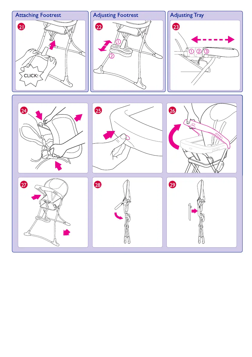 Graco Snack n' Stow - Attaching Footrest; Adjusting Footrest; Adjusting Tray; Folding Highchair