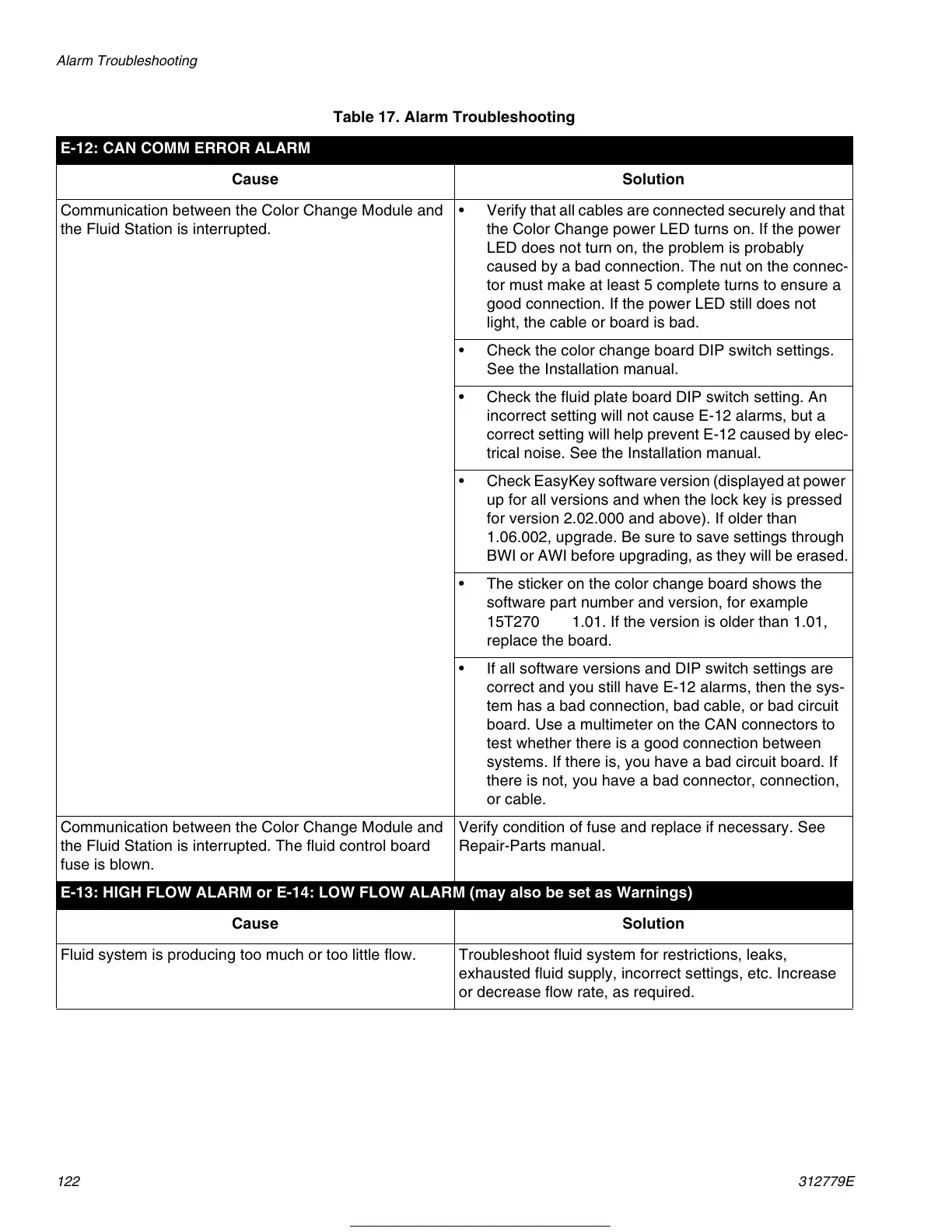 E-13: HIGH FLOW ALARM or E-14: LOW FLOW ALARM (may also be set as Warnings)