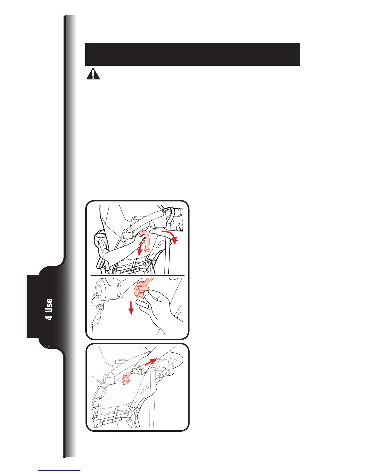 When making adjustments to the stroller seat, make sure child’s head, arms,