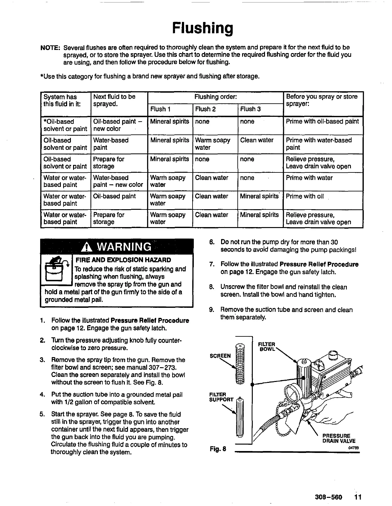 sprayed, or to store the sprayer. Use this chart to determine the required flushing order for the fluid you