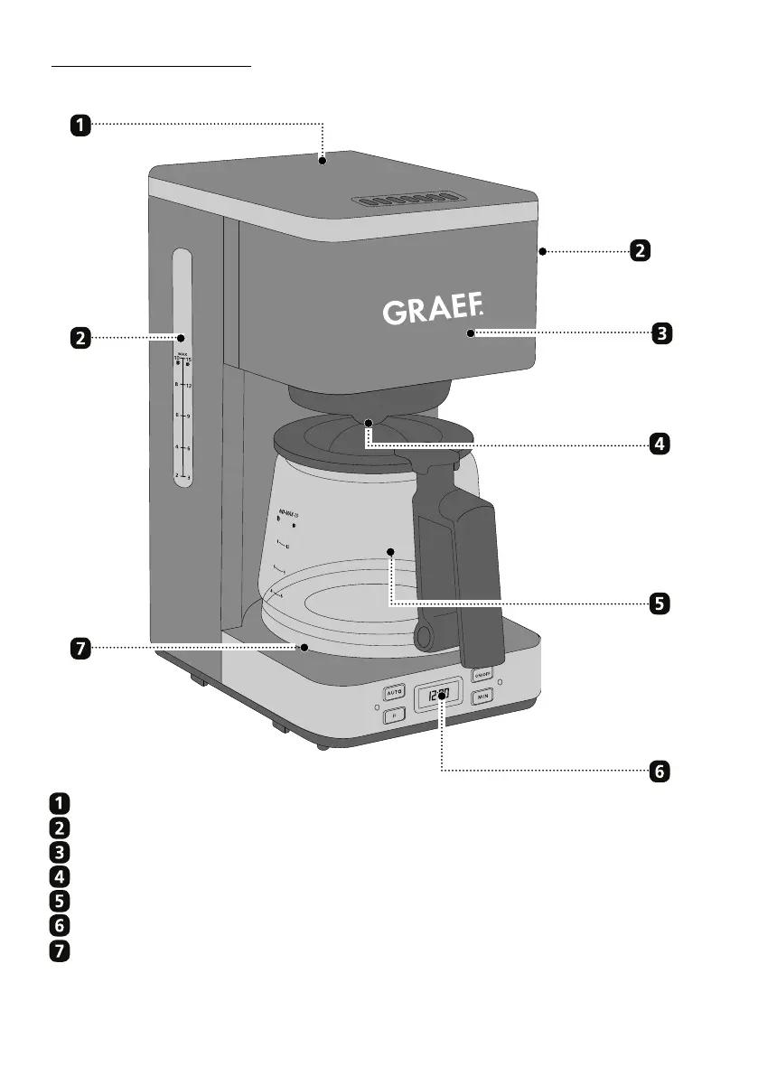 Graef FK 502 - Product Description and Components; Water Tank and Level Gauge; Coffee Filter Holder and Drip Stop; Glass Jug and Hotplate