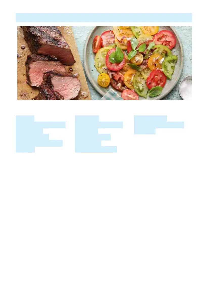 4. Bland tomatene med vinaigretten for servering, skjær steikene i strimler og legg på. Garner
