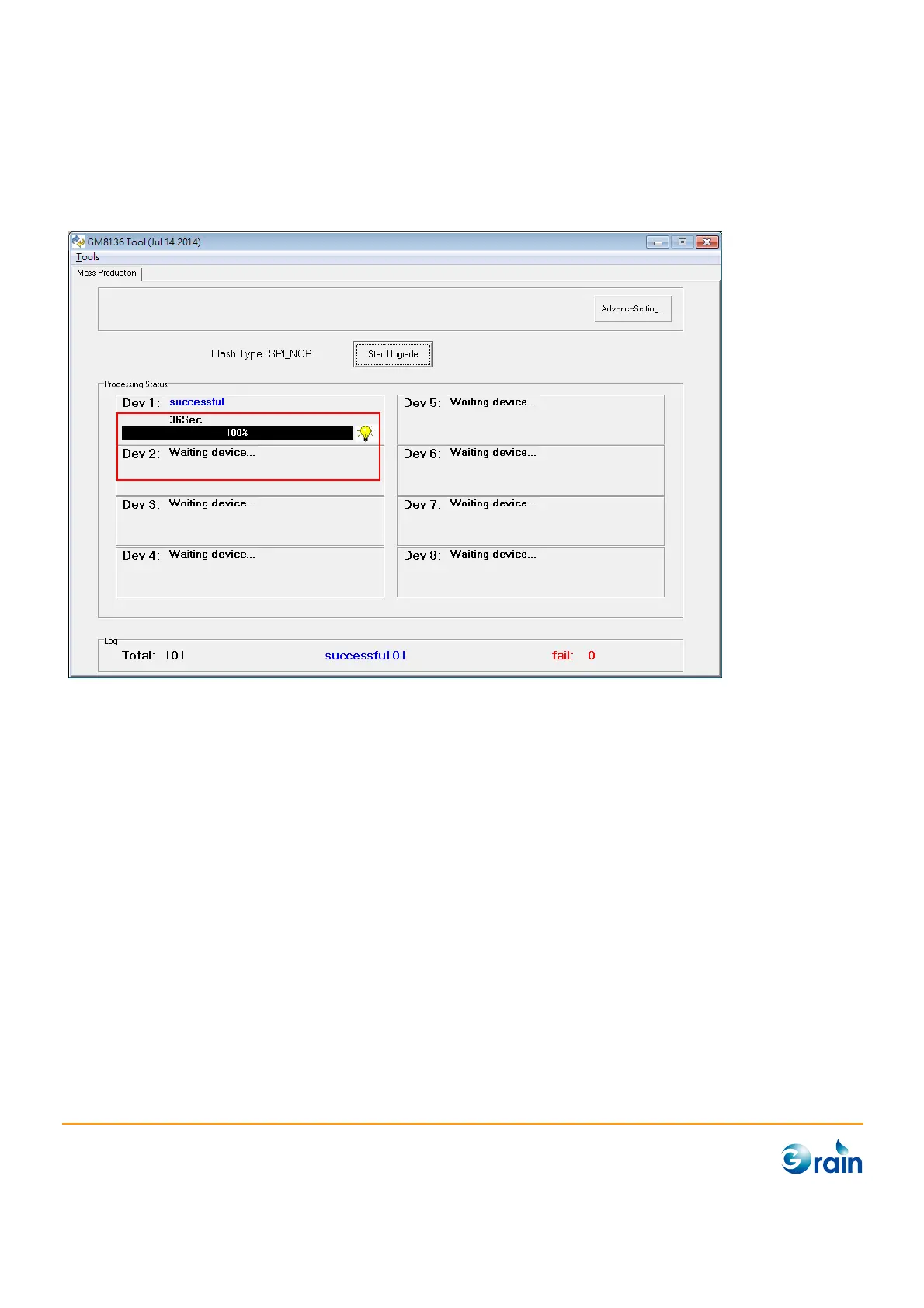 If upgrade is finished successfully, the device information bar will show “100%”.