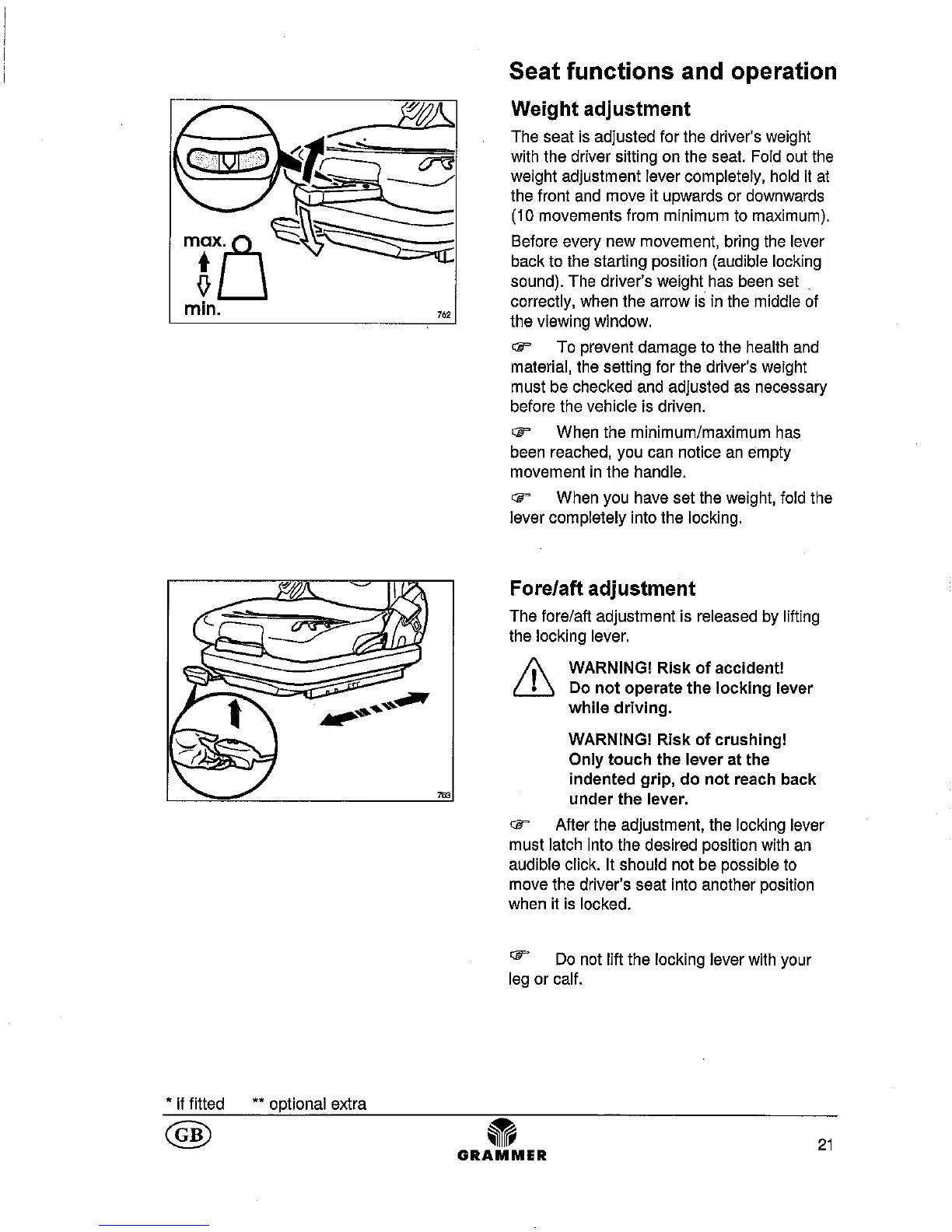 Grammer MSG65 - Seat Functions and Operation; Weight Adjustment; Fore;Aft Adjustment