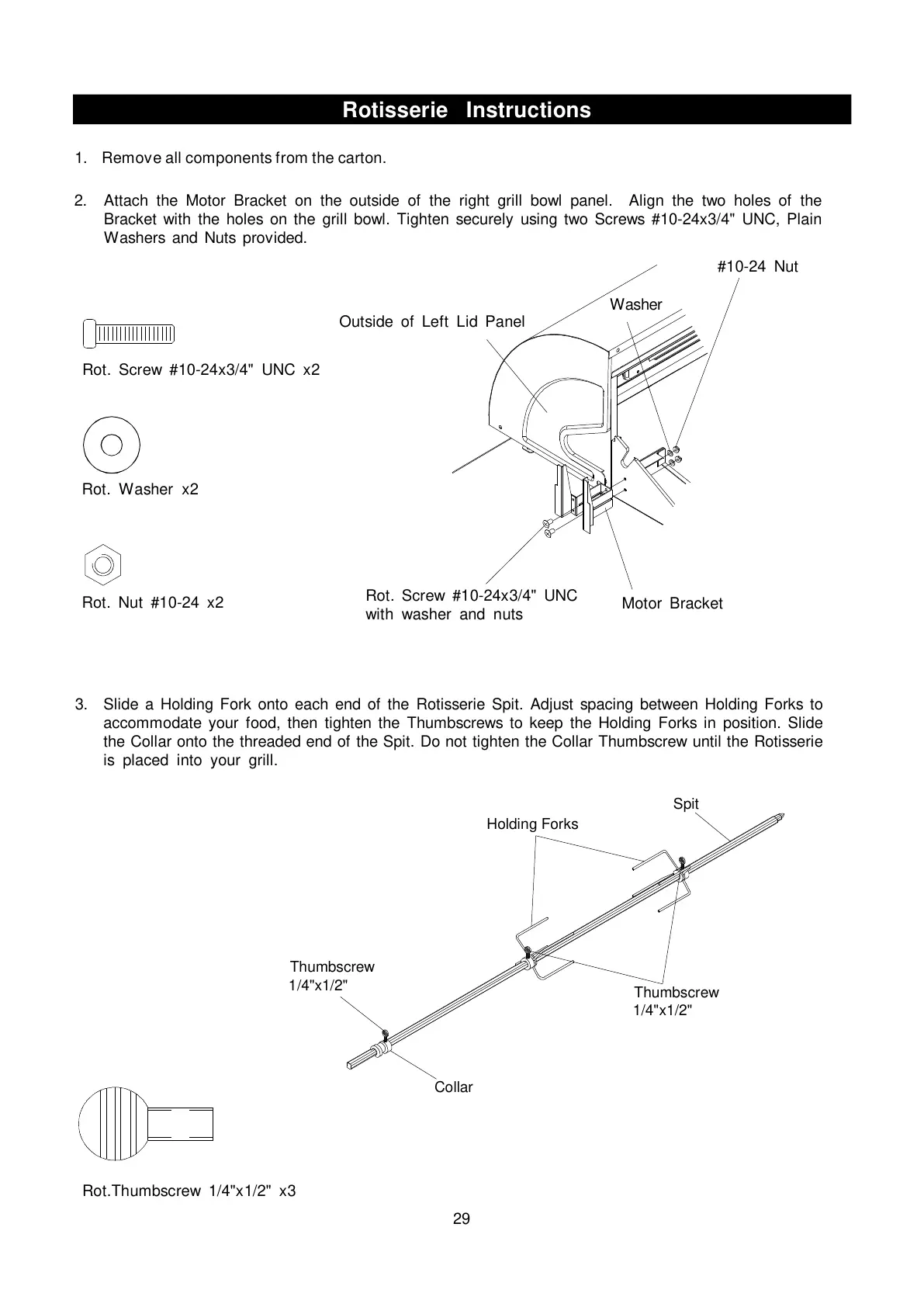 Bracket with the holes on the grill bowl. Tighten securely using two Screws #10-24x3/4" UNC, Plain
