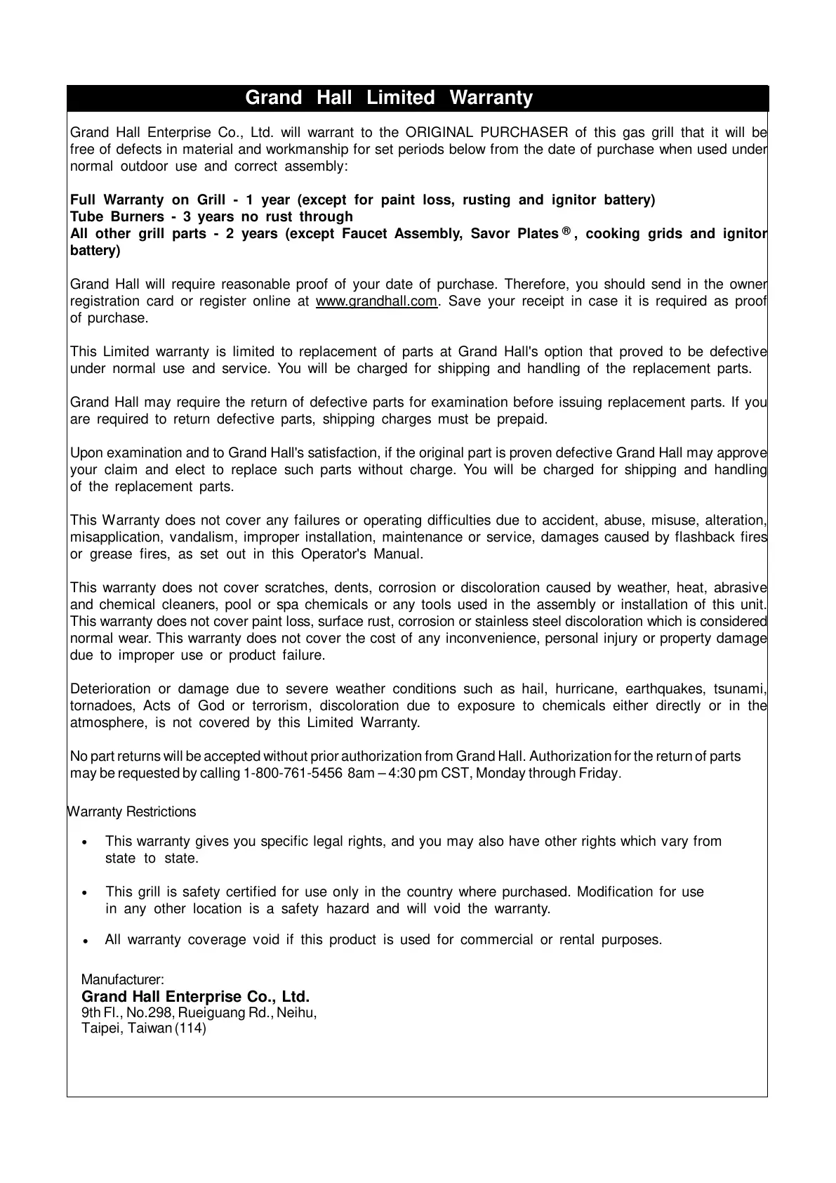 Grand Hall Enterprise Co., Ltd. will warrant to the ORIGINAL PURCHASER of this gas grill that it will be
