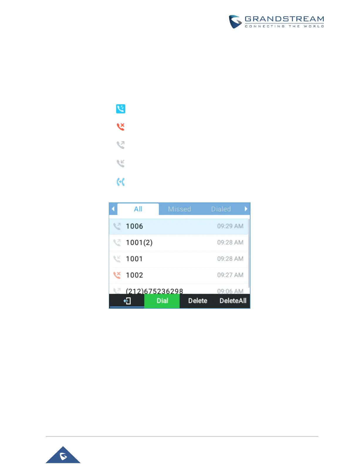 There are five different categories in the local call history. Users could use the navigation keys to browse