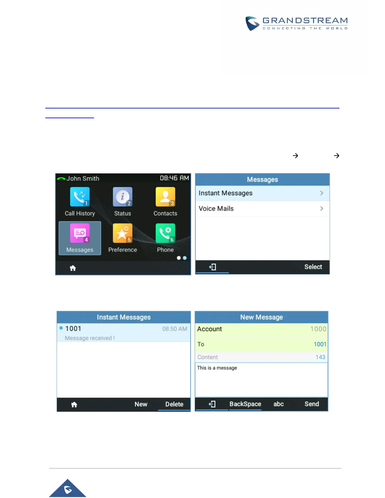 Users can press “New” soft key, then specify the Account, the recipient and the contents of the IM.