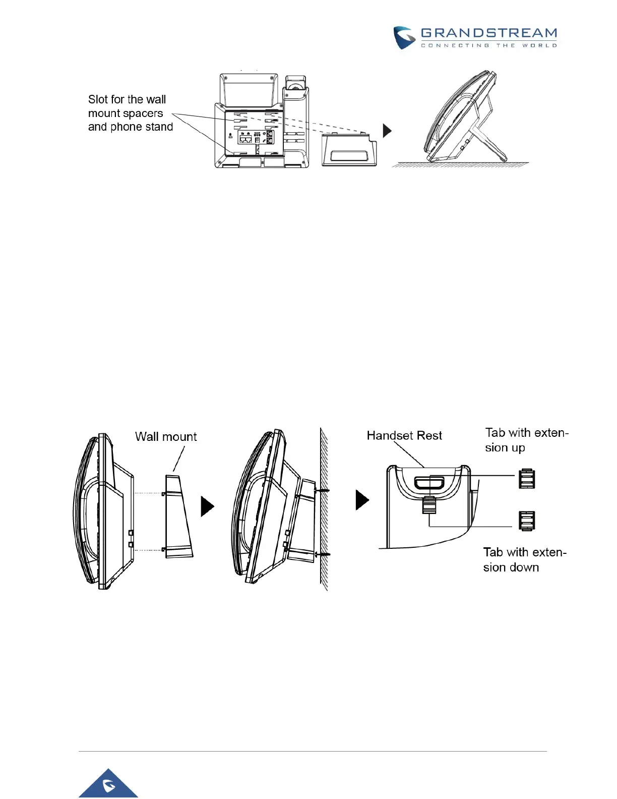 1. Attach the wall mount spacers to the slot for wall mount spacers on the back of the phone.