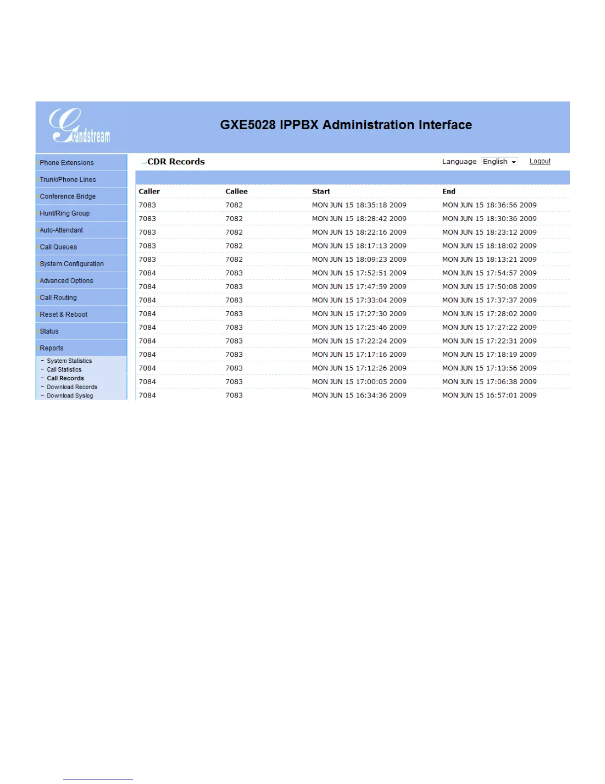 The Call Records sub menu displays detailed information such as the Caller/Callee extension number