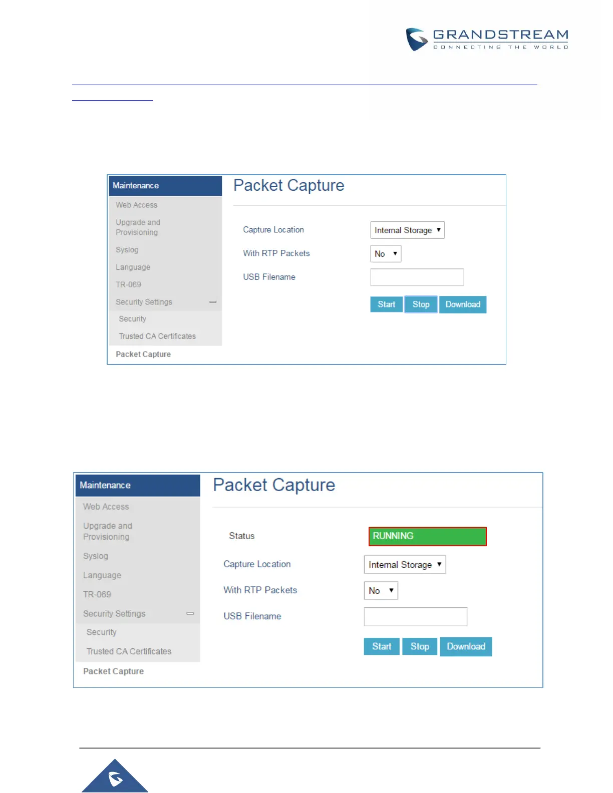 When the capture configuration is set, press Start button to start packet capture. The Status will become