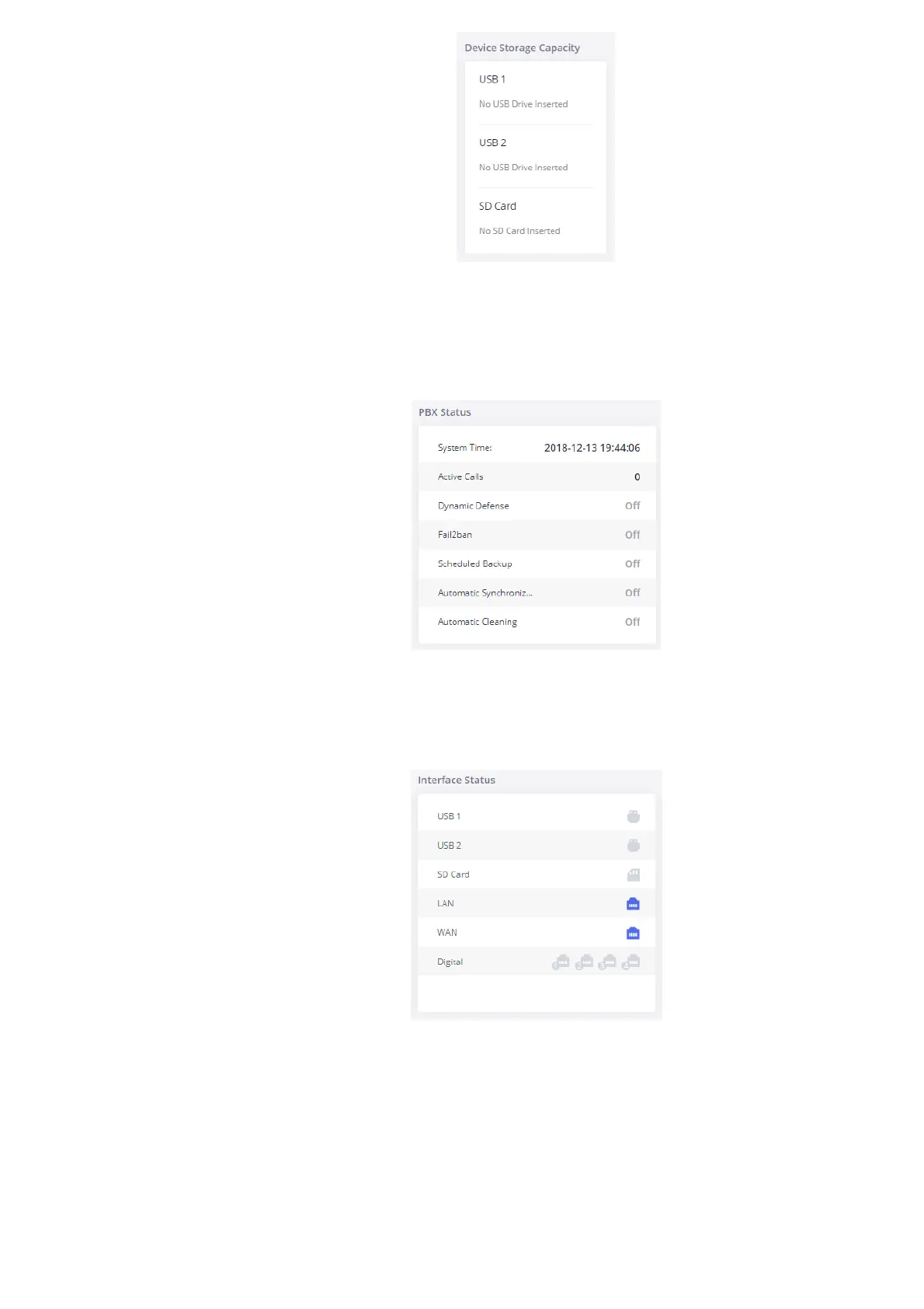 This section displays the interface connection status on the GXW450X for USB, SD Card, LAN, WAN, and Digital interfaces.