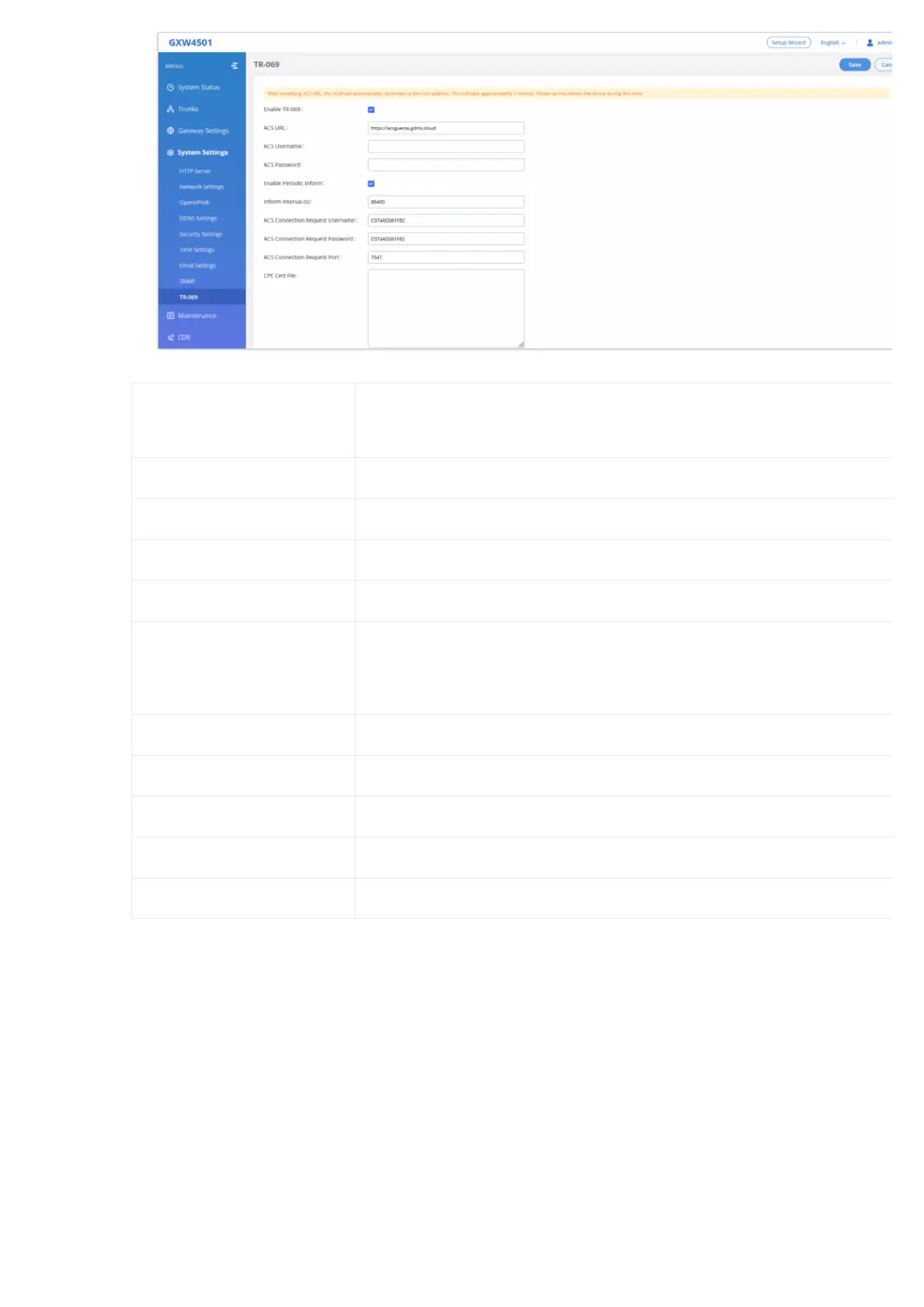 ACS URL Specifies URL of TR-069 ACS (e.g, https://acsguesta.gdms.cloud), or IP address.