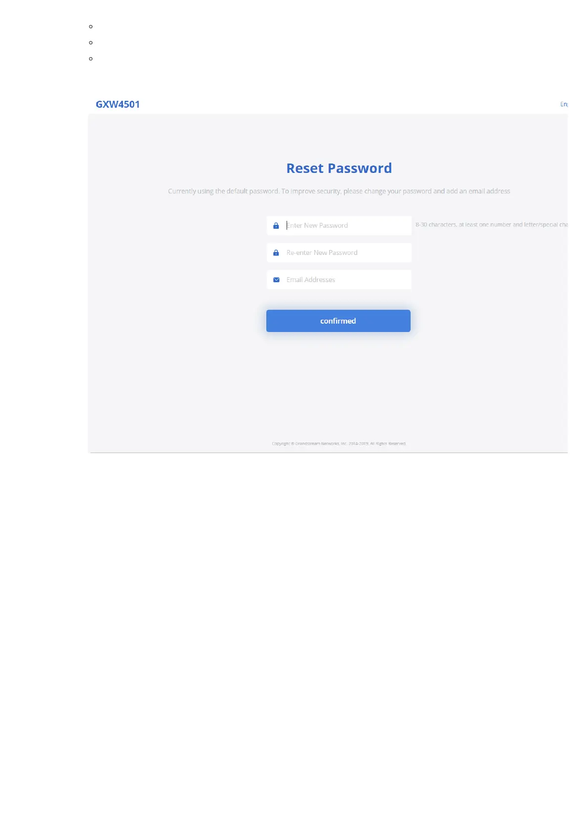 When the user logs in to the GXW450X Web GUI for the first time, he will be asked to change the default password and add an email address to im