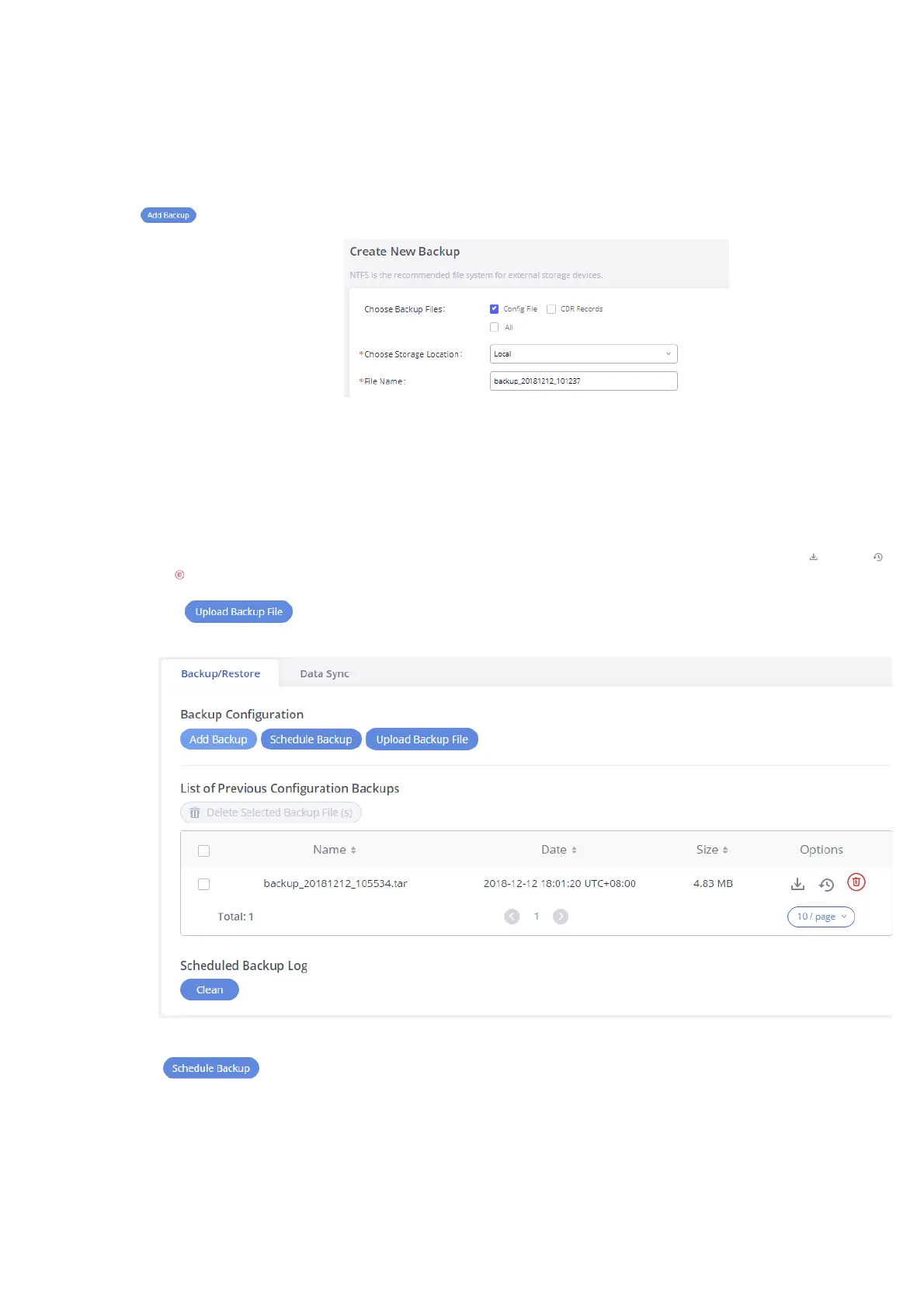 Once the backup is done, the list of the backups will be displayed with the date and time on the web page. Users can download , restore , o