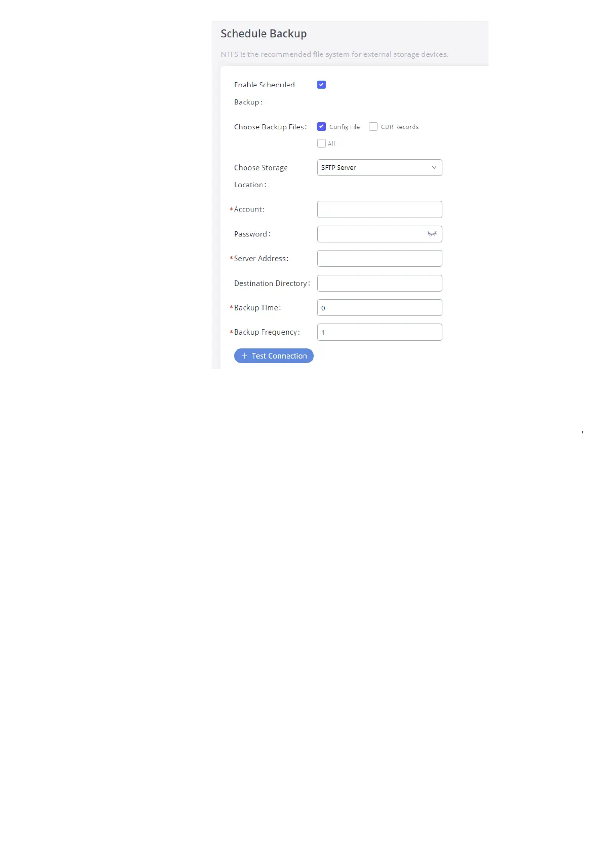 Besides local backup, users could backup the voice records and/or CDR on a daily basis to a remote server via SFTP protocol automatically under W