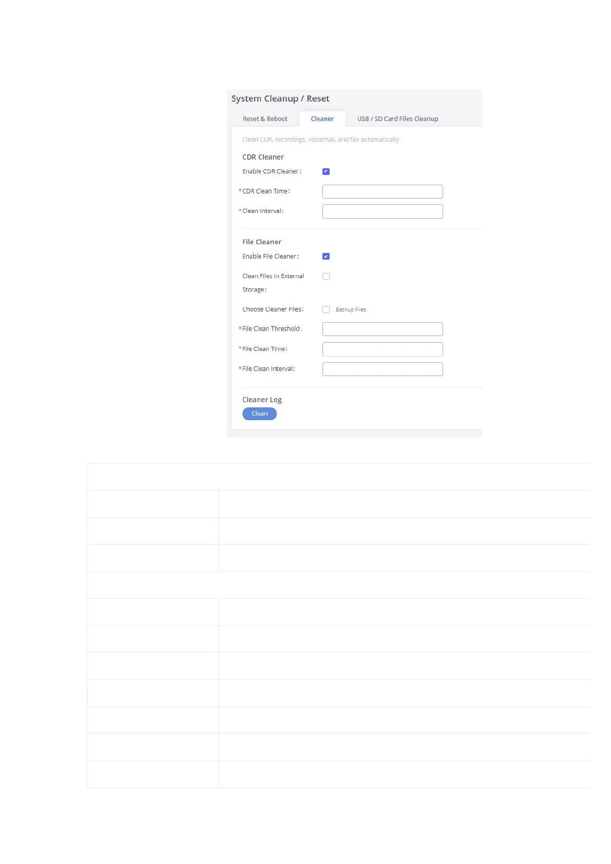Users could configure to clean the Call Detail Report/Voice Records/Voice Mails/FAX automatically under Web GUI🡪 Maintenance🡪System