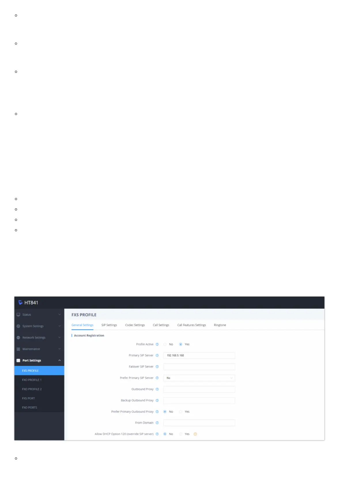 Go to FXS Profile (same steps for FXO Profile 1&2) web pages and set the following: