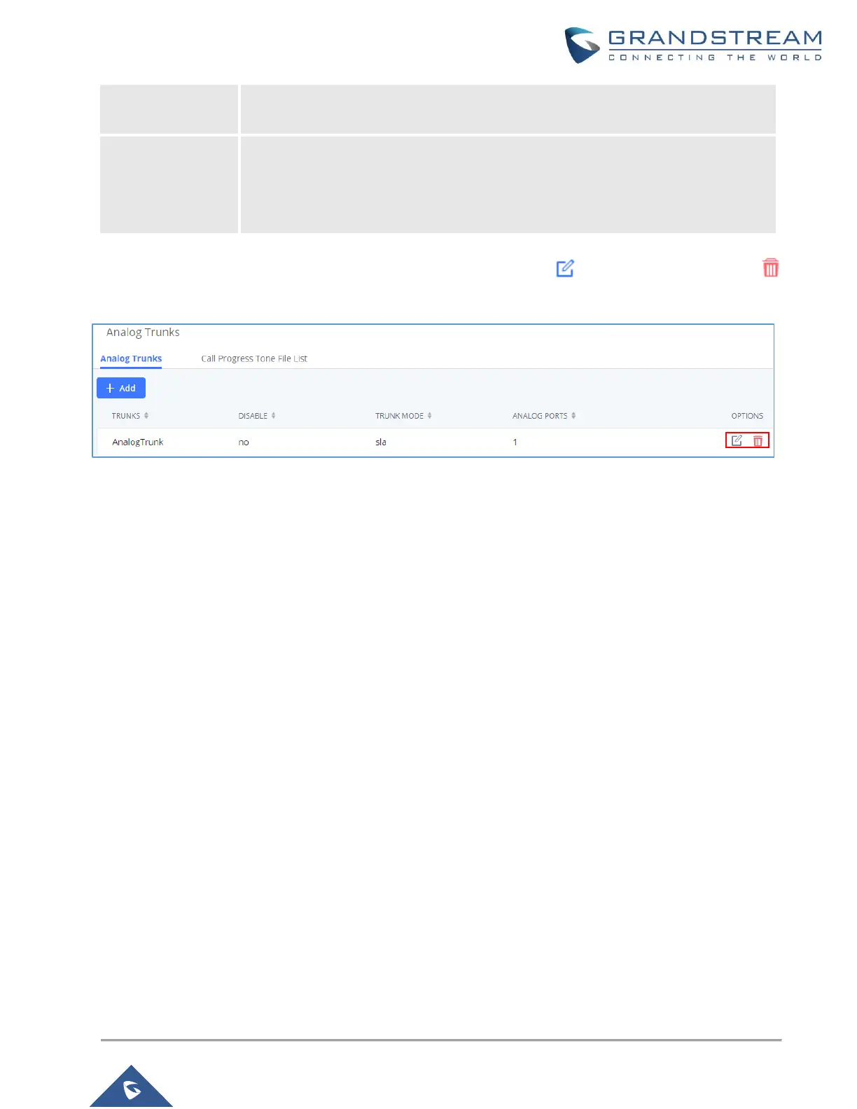 Once the analog trunk is created, it can be edited anytime by clicking on icon or deleted by clicking on