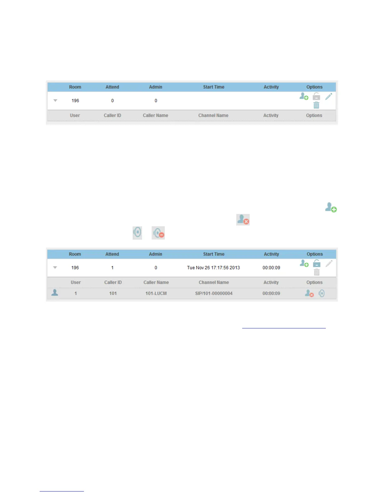 status. This provides the admin with details on which conference room is active, who the participants are