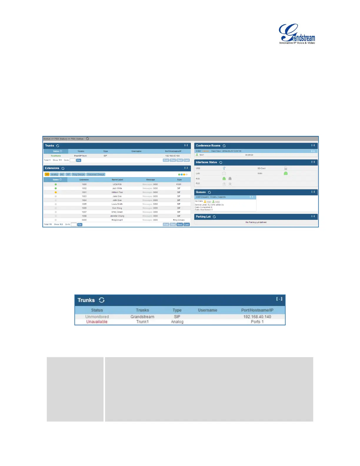 The UCM6100 monitors the status for Trunks, Extensions, Queues, Conference Rooms, Interfaces and