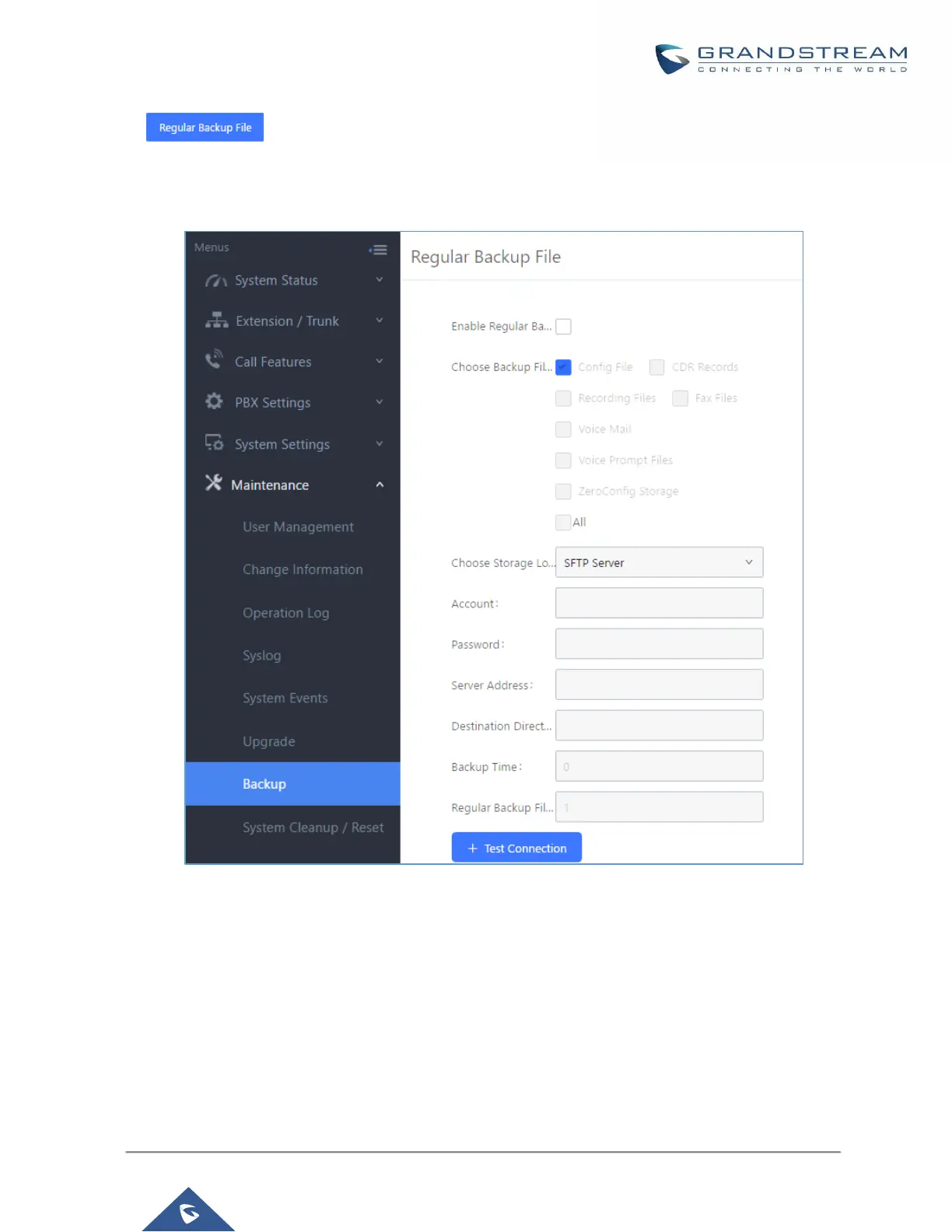 Besides local backup, users could backup the voice records/voice mails/CDR/FAX in a daily basis to a remote