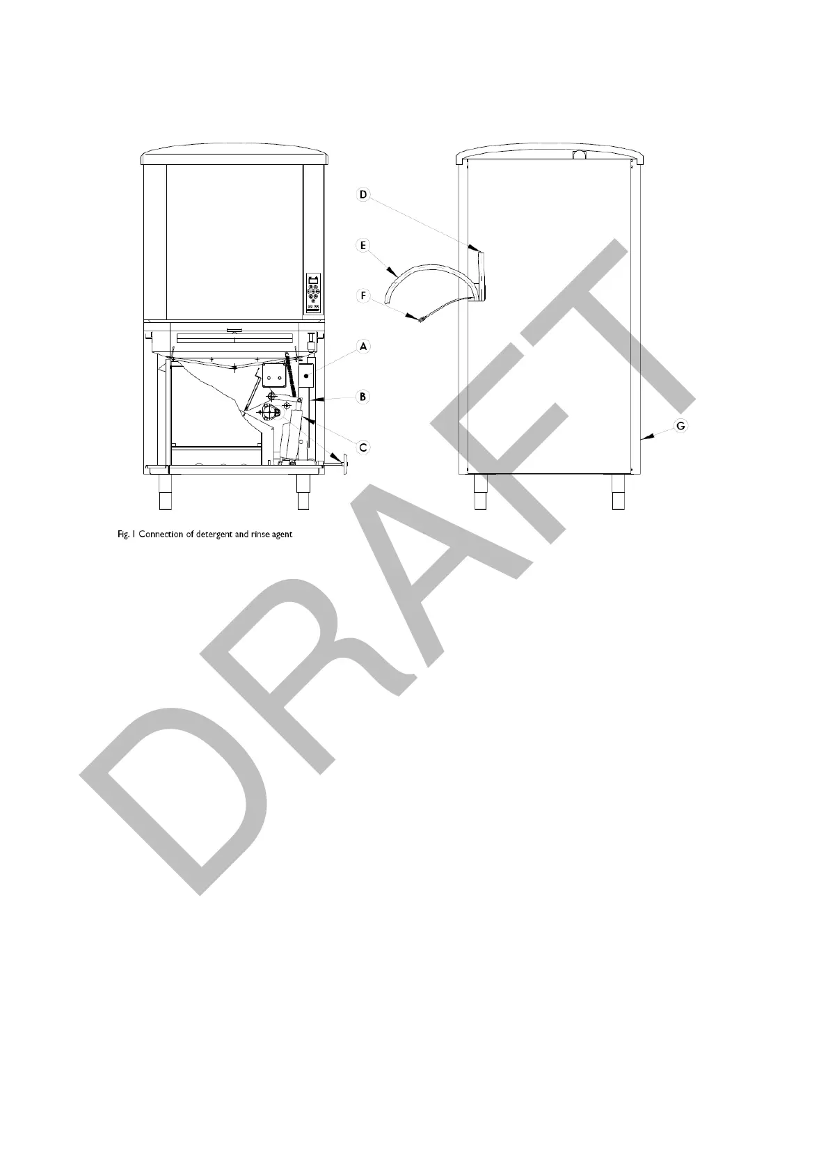 The machine is also prepared with a rinse aid connection (F) at the same point. The