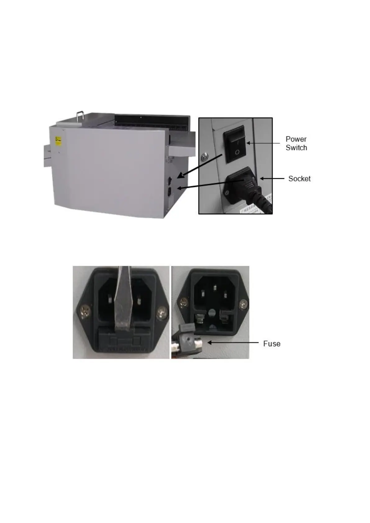 The power socket and switch are both on the operator side of the unit. Before