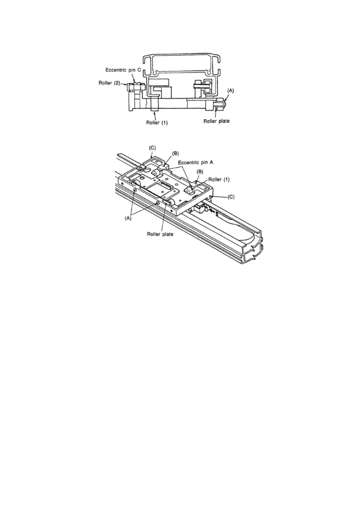 • Loosen the set-screws (C) at the two eccentric pins C, then move roller (2) outside of the Y slider and