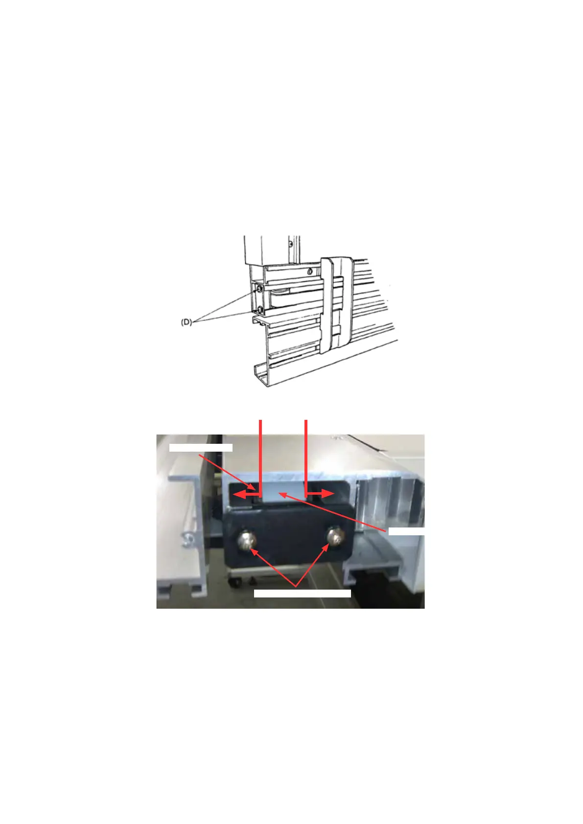 (3) Adjust the two M3 binding head screws indicated by the (D) arrows so that the belt is balanced right and