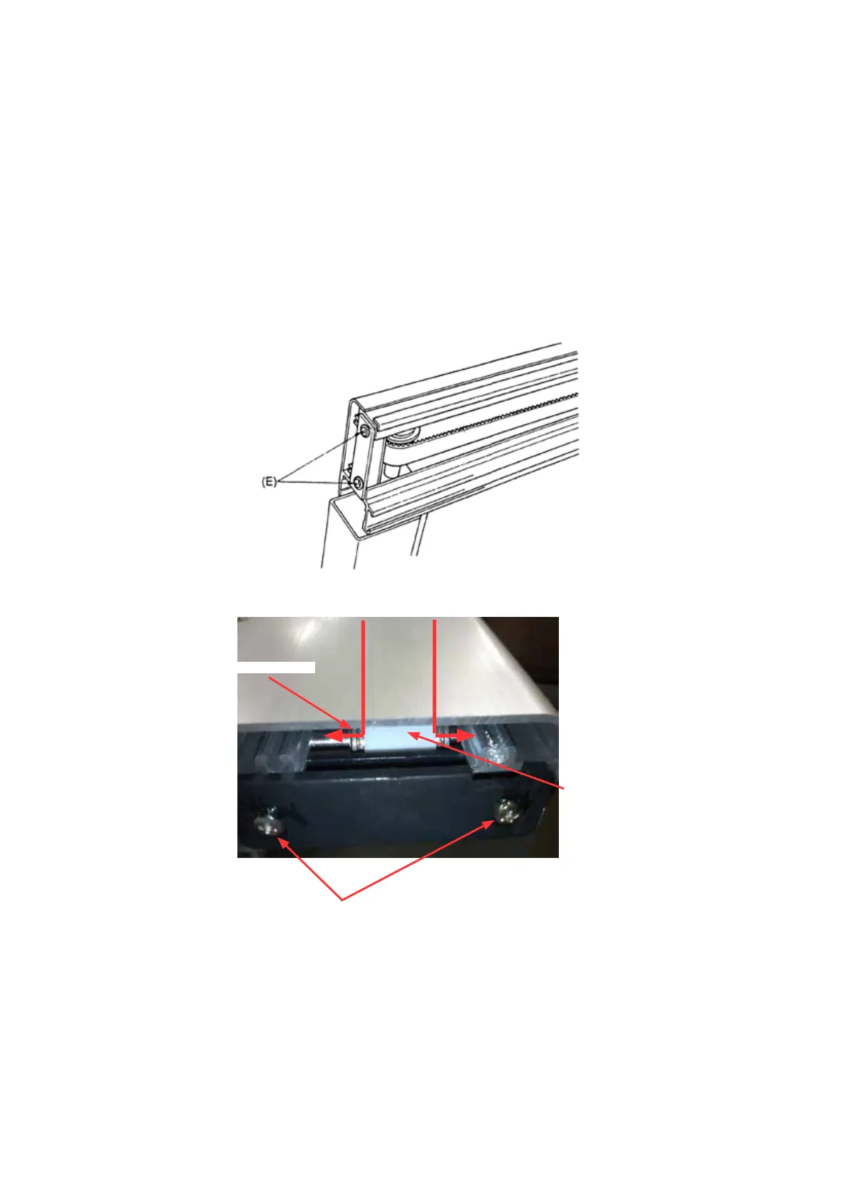 (3) Adjust the two M3 binding head screws indicated by the (E) arrows so that the belt is balanced right and
