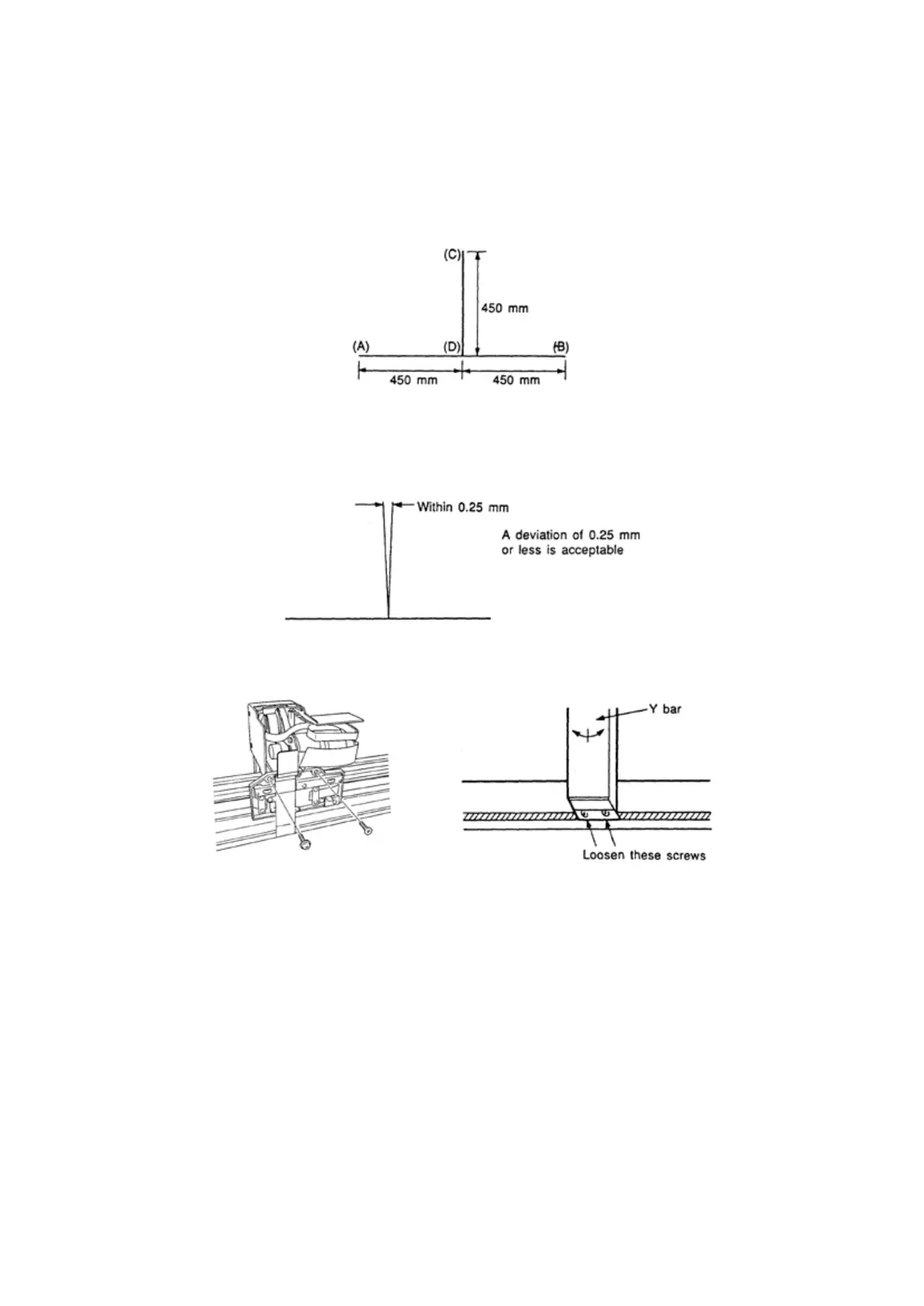 (5) If the deviation exceeds 0.25 mm, loosen the screws at the top and bottom of the Y bar and adjust the